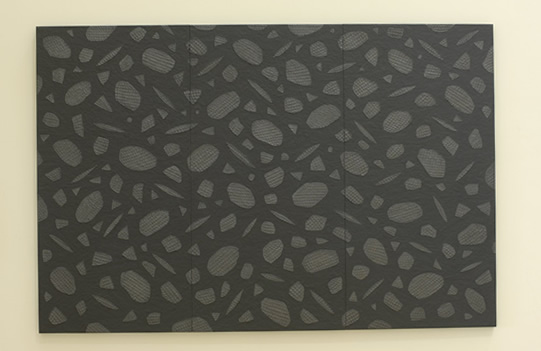 石庭「枯山水」は禅宗のもと、大小の石によって構成された庭園である。京都龍安寺「方丈の前庭」と銀閣寺の「向月台と銀砂灘」は特に名だたるものである。私たちがそれらを見る時には、イメージの力が必要になる。イメージは自己の内側にあるものだから、そこには自己との対話が生まれるのである。そのような日本の伝統を私は「美しい」と思い、またそれを受け継いでゆきたいと思っている。私の作品も「枯山水」と同様に見ていただきたい。そこにあるのは、画面に押された指の跡が作り出す、大小のかけらと硫化した銀による色しかない。だからこそ、自己との対話が可能になるのである。