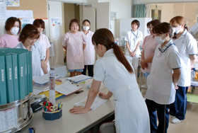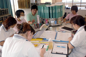 4階病棟は、30床の病棟で、主に長期療養の入院患者さんを受入れています。日常生活の援助を通じて、患者さん一人ひとりの生活レベルを維持向上するために、日々、病棟スタッフの協力のもと努力しています。また、患者さんやご家族の要望を活かし、個別性ある看護・介護を行うよう、スタッフの一人ひとりがケアの質の向上を目指し、病棟独自の学習会やカンファレンスを開催し、積極的に参加しています。これからも患者さんやご家族に安心して入院していただける環境を整え、ケアを提供していきたいと思います。